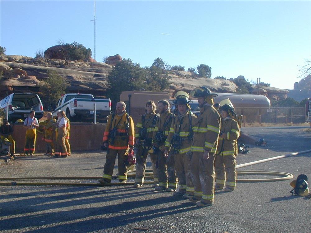 Firefighter crew photos during structural fire training at Mesa Verde National Park, 2001