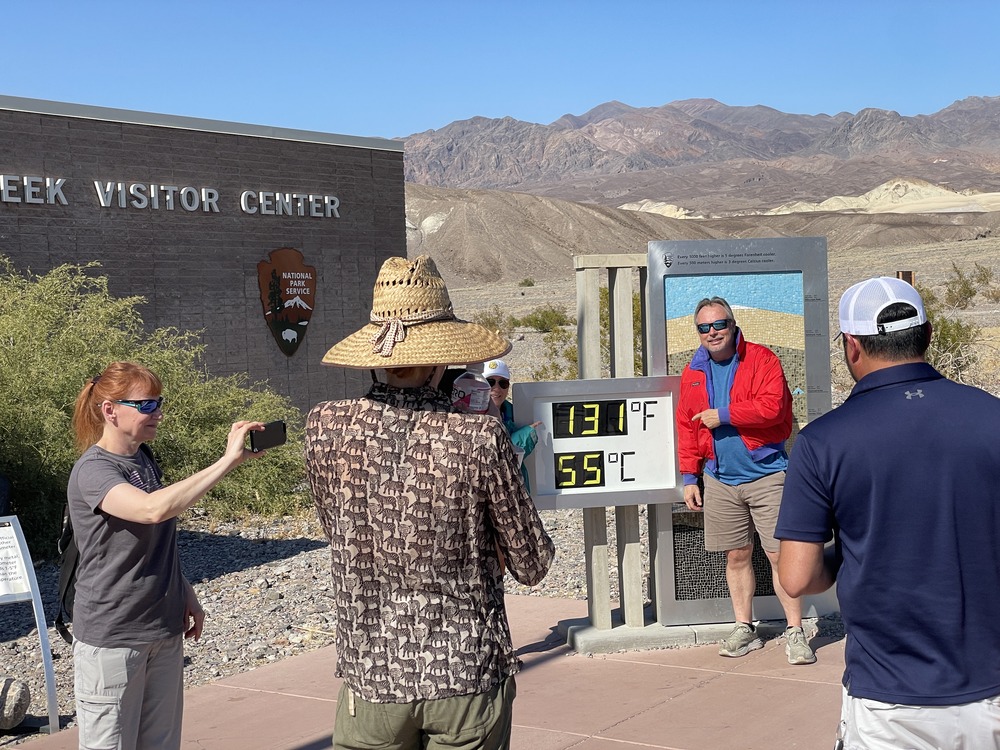 Visitors with the Furnace Creek Visitor Center display thermometer, wearing coats out of humor. This thermometer reads 131 degrees F; the official temperature was 129F that day (7/7/24).