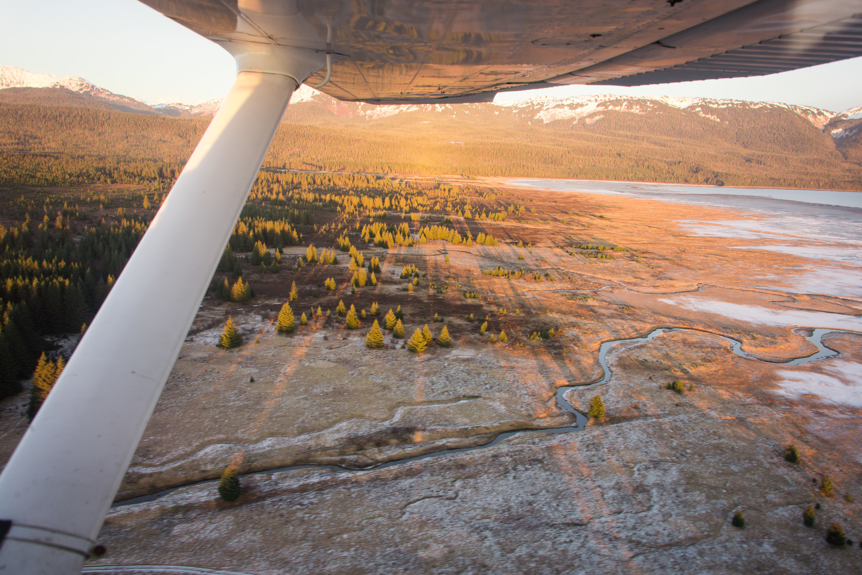 Orange and yellow sunlight illuminates Gustavus from a seaplane window.