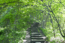 A series of wooden steps flanked on both sides by thick foliage head up and to the right slightly mark the beginning of the Red Dot Trail at Mount Tammany