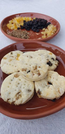 A plate of nice, circular cookies with chunks of dried fruit popping out. Behind it, a plate heaped with seeds and piles of dried, colorful fruits.