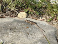A brown and tan striped lizard sets on a large stone near short vegetation.