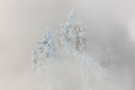 Trees covered in rime ice emerge from the steam of Beryl Spring