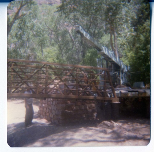 New Grotto footbridge being lowered into place by pulley system, crane and backhoe anchoring one end of bridge. Note riverbank revetments. ; ZION Museum and Archives Image 005.06.02-18of53 ; ZION 15933