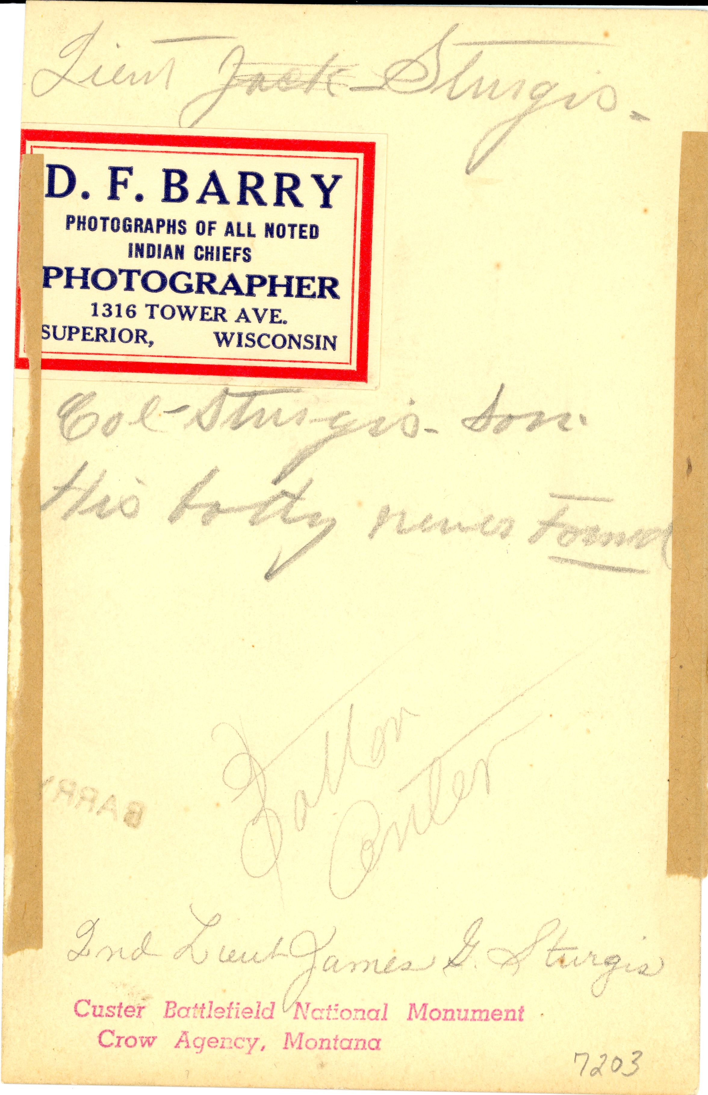 LIBI_00011_07203; A black-and-white white photograph (possibly collodian print) of 2nd Lieutenant James G. Sturgis; D. F. Barry copyrighted photograph, with Barry label on verso of portrait; created on unknown date. [Note: Sturgis killed with the Custer battalion while serving with Company E. Sturgis was normally assigned to Company M. Sturgis' body was never identified on the battlefield. He was also the son of the Regimental Commander Col. Samuel Davis Sturgis.]; PRINT, PHOTOGRAPHIC; Courtesy of the National Park Service, Little Bighorn Battlefield National Monument, LIBI_00011_07203, D. F. Barry, "Second Lieutenant James G. Sturgis," date unknown