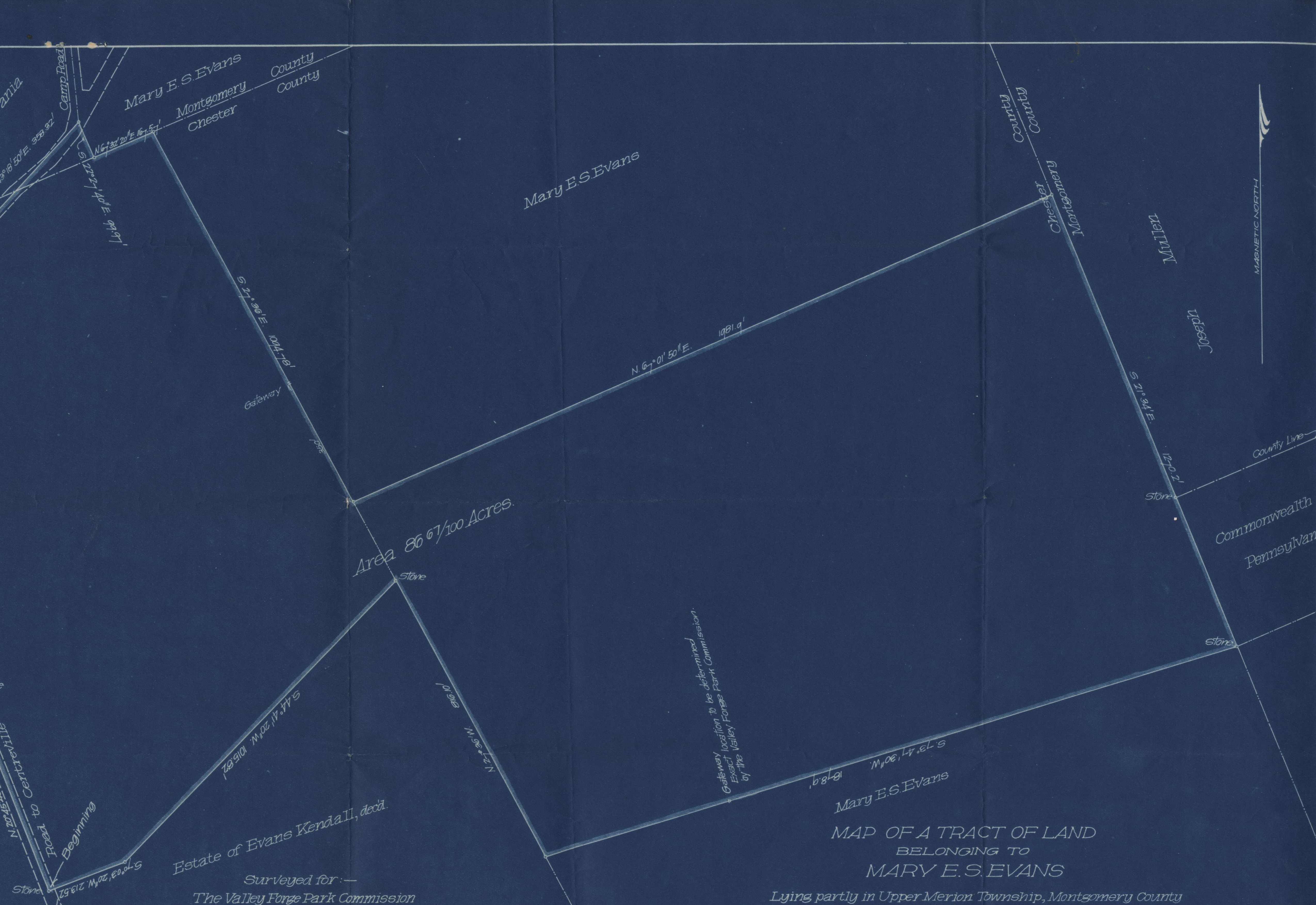 Document: Description of a Tract of Land A Portion of the "Continental Camp Farm" of Mary E.S. Evans, Lying partly in Upper Merion Township, Montgomery County, and partly in Tredyffrin Townsip, Chester County, Pennsylvania