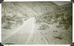 This is an historic black and white photograph from the Scotty's Castle Historic Photograph Collection, Death Valley National Park of desert canyon and wash. Two track dirt road lead down from wash. Narrow wash thick with gravel. On left a steep canyon wall. On right a hillside. Sparce vegetation leading up from road to hillsides. Number in black ink in lower left corner.