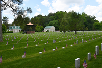 The Superintendent’s Lodge, maintenance building, and rostrum in the background and in the fore ground American flags stand in front of white headstones.