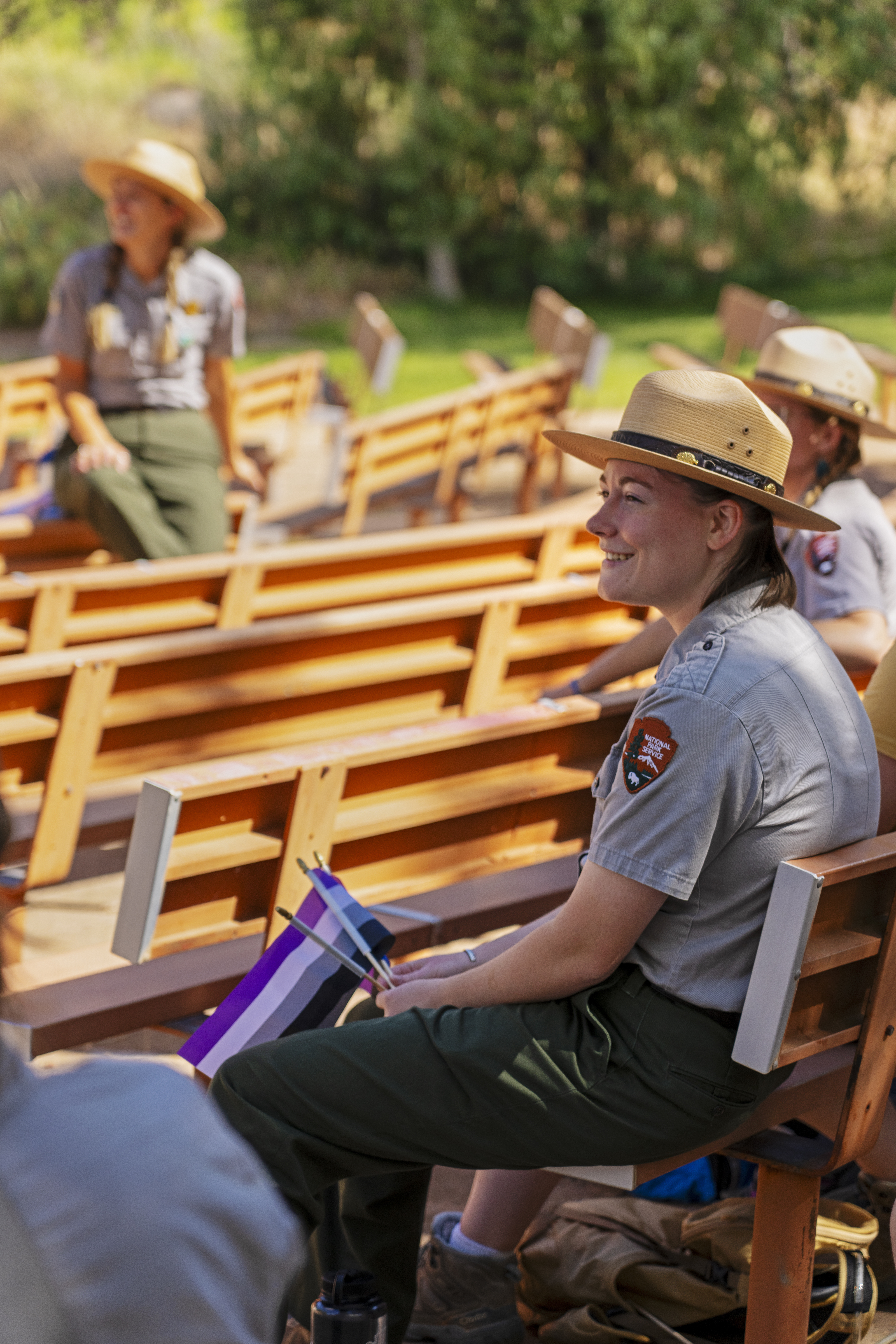 A park ranger in a flat hat sits on an orange bench holding a small striped flag.