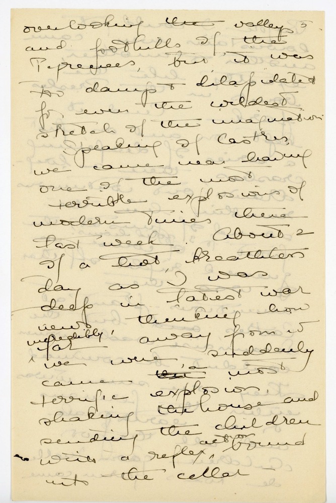 Speaking of Castres, we came near having one of the most terrible explosions of modern times here last week. About 2 of a hot breathless day as I was deep in latest war news, thinking how ^incredibly^ far away from it we were, suddenly came the a most terrific explosion, shaking the house and sending the children with a reflex ^action^ bound into the cellar — [p. 10] Before I could get downstairs even came another & another, exactly like the bombs in the Presles park. And it kept on and on, first a series of deafening crashes, then a long-drawn-out continuous rumbling like the sound of guns at the front ^for 3 solid hours!^ Of course we guessed right off that it was the munitions plant at Castres, and but the Lacaunaise washerwomen couldn’t be convinced. They were sure it was either the Germans or an earthquake, and all the poor children from Melle[?] de Rose’s farm came [p. 11 marked 6] tumbling down in terror with cries that the mountains were crumbling. I wish you could have heard our boys’ scornful remarks, from the height of their years of bombardment! It was a pretty agonizing afternoon, for there was no way of getting into touch with Castres. We had no doubt but ^were sure^ that the whole town had been wiped out, if we at 52 kilometes it could make such a terrific noise. The only train of the day had left & there wasn’t an automobile to be had in Lacaune. Even [p. 12] if there had been, our 15 litres of [escence?]/the sole supply in the village, wouldn’t have got us there. So we had miserably to wait with all the rest, planning out with the mayor how many wounded we could take in and feed etc. etc.