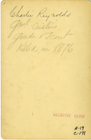 LIBI_00019_00171; An albumen cabinet card (card-mounted photograph) of Charlie Reynolds in a bust side profile. The photograph is 4 1/4 x 6 1/2" mounted and was produced circa 1875 by an unknown photographer. On the verso, a handwritten notation in blue ink and pencil reads, "Charlie Reynolds/Gen'l Custer's/Guide Scout/Killed in 1876." Note: "Pkg 1/Box 1" handwritten on the verso. Photograph reprinted in "The Custer Album" by Lawrence A. Frost, page 137.; CABINET CARD [Card photograph]; Courtesy of the National Park Service, Little Bighorn Battlefield National Monument, LIBI_00019_00171, Unknown Photographer, "Charley Reynolds in Bust Side Profile," circa 1875