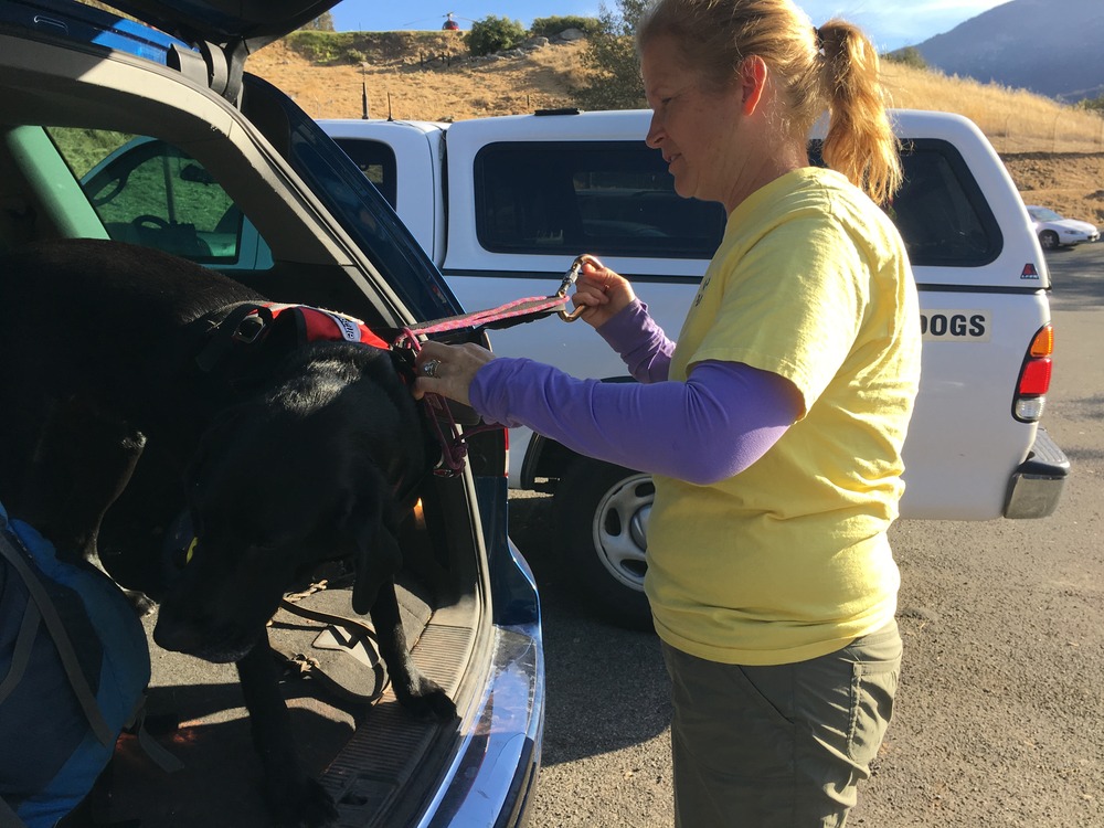 A search dog prepares to jump out of a vehicle with its handler.