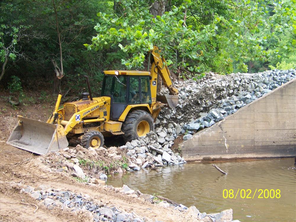 South far side of Lake 1 Dam rip rap stone being replaced