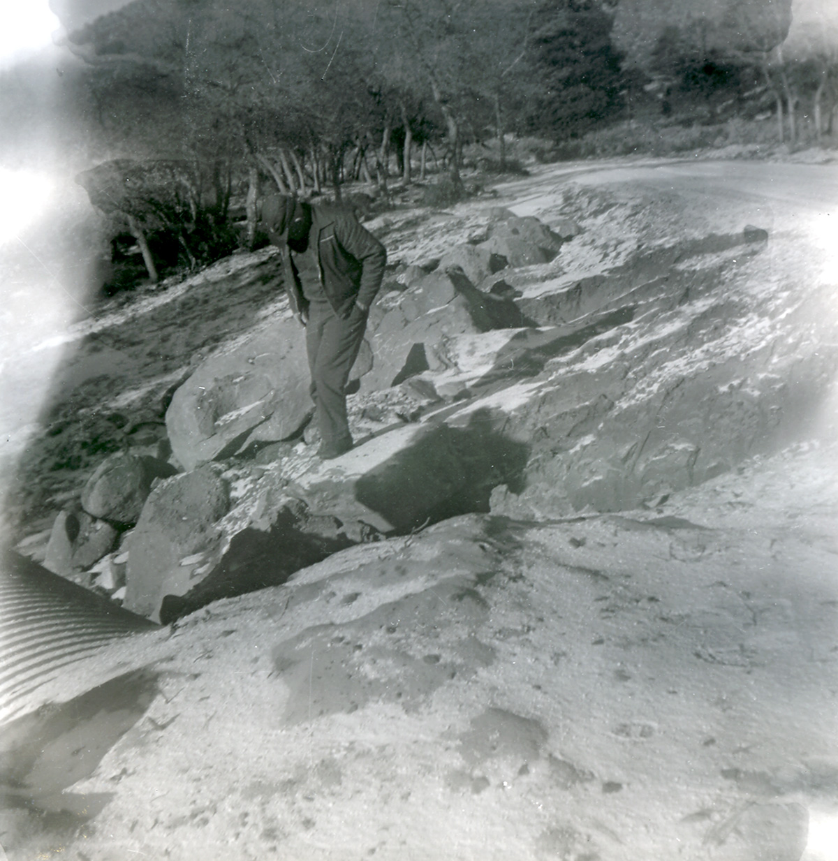 Man inspecting roadside progress during road work along the scenic canyon drive near the Grotto. ; ZION Museum and Archives Image 002.03.05-33of37 ; ZION 15933