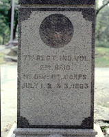 1 of 6 monuments to Indiana. Indicates position taken by 7th Indiana evening July 1, 1863 & held until July 5, 1863, excepting reconnonissance duty to Gettysburg. Located on Culp's Hill summit N of Observation Tower. || Mn base 4'sq w/ incised company name. 2 part shaft, 1st: smooth face & polished excised "Indiana," 2nd: smooth face granite & polished granite inscriptions, state seal, crossed rifles all faces. Pryamid top, missing 1st corps ball apex. All 8'H.
