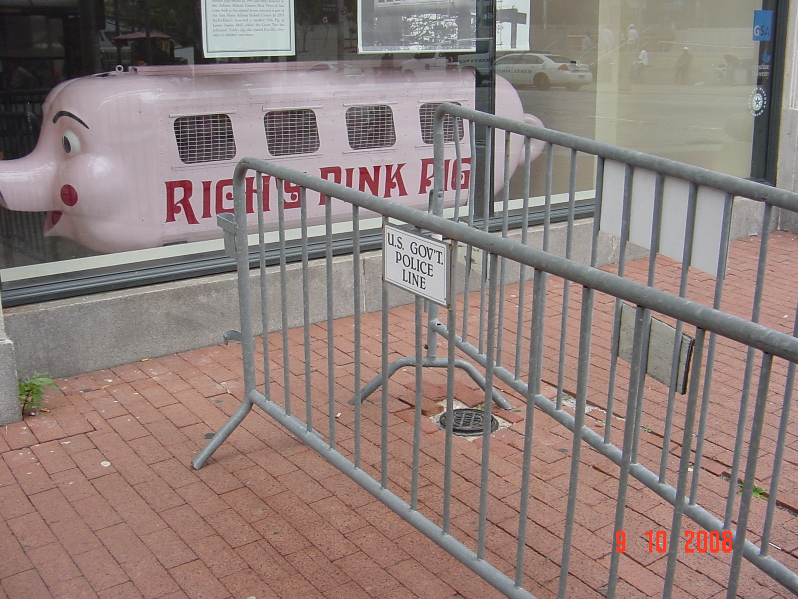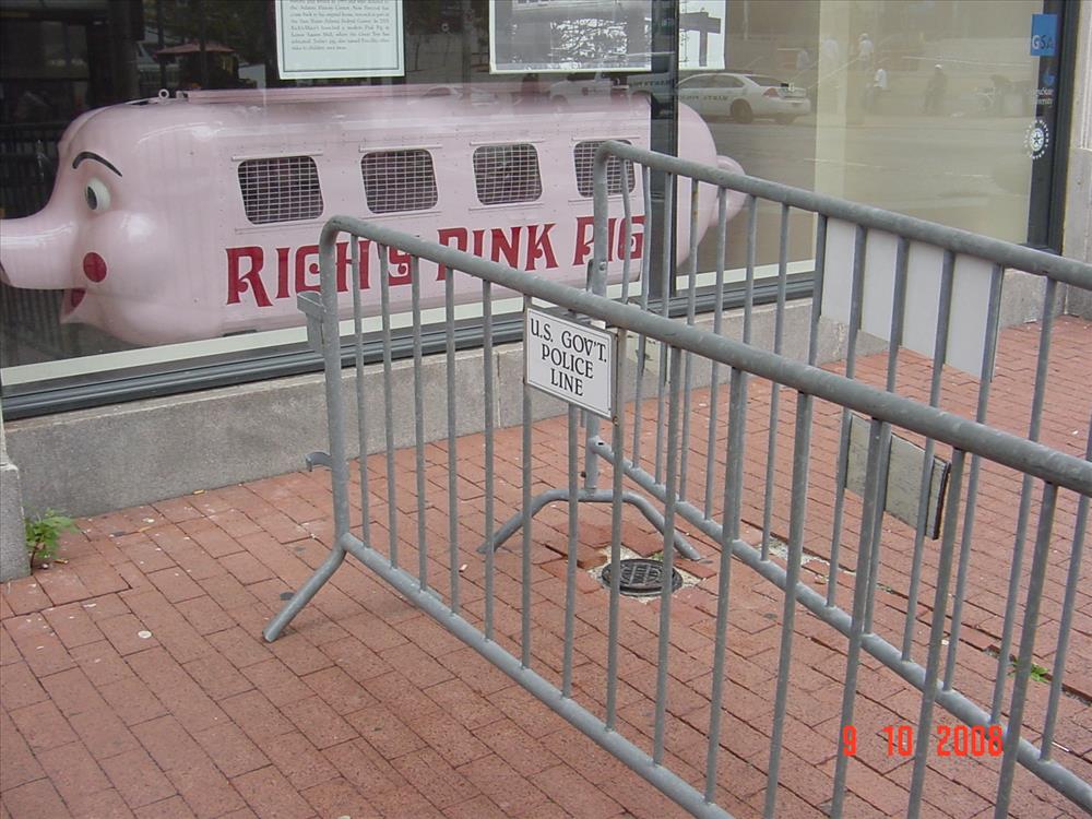 detail of "U.S. Gov't Police Line" barrier with the Pink Pig in background