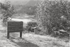 Black and white photograph of a sign and picnic tables next to a lake