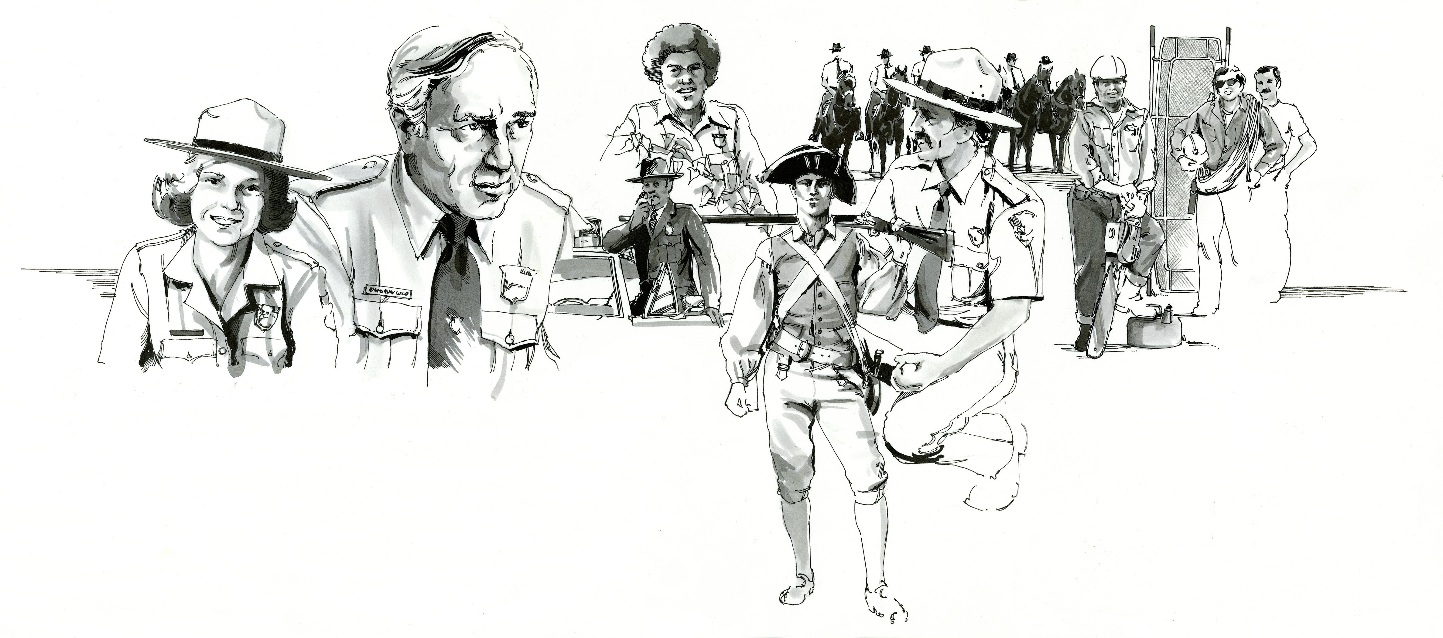 The series of figures, most in National Park Service uniforms, represent various occupations/tasks benefiting the National Park Service and/or park visitors: a female park interpreter, a park superintendent, a park naturalist, park law enforcement, a park volunteer (reenactor/Living History), United States Park Police patrol (mounted on horseback), a male park ranger, park maintenance (groundskeeper or laborer holding chainsaw); and a park search and rescue crew