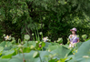 Visitor standing behind a field of lotus plants