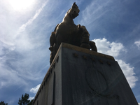 A bronze statue of a man riding a horse on top of a granite podium