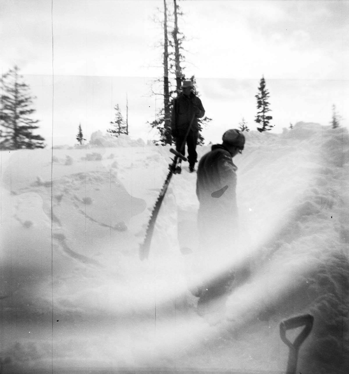 BW Photos showing rangers digging out the visitor center from snowdrift. ; ZION Museum and Archives Image 905_04_01020 ; ZION 15933