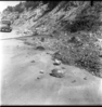 BW photos of rock slides in Kolob Canyons - 2x2. Ranger with camera reaching into crack in the road. ; ZION Museum and Archives Image 107_06_23012 ; ZION 15933