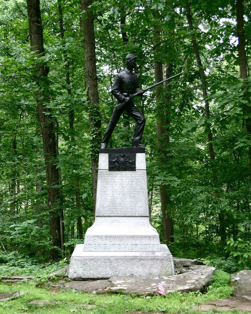 1 of 110 mns in Park to Pennsylvania commands in Gettysburg Campaign. Marks position of 145 PA when driving Confederates of Kershaw's Brigade from edge of Wheatfield to point beyond this position. Located on NE side of Brooke Ave in Rose Woods. || MN & 2 Flank Markers. Hammered base, 6'5" sq. Shaft, 3'4"x2'4", topped w/ statue of infantryman w/ musket. All 10'9" high. Inscriptions incised on shaft & State coat of arms on S. Flank markers, 1'x1'x1'6", flat-topped w/ inscription on face.