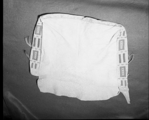 Mrs. Geraldine McConnell Collection. Object: Plains type beaded bag. Dimensions: Front - 22" x 13 1/2" Back - 18 1/2" x 18" wide at top and 16" wide at bottom. Side panels - 2 1/2" x 13 1/2" Bottom panel - 1 1/4" x 16 1/2". Technology & Materials: Brain ta