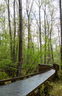 two woman walking on a wet boardwalk after a thunderstorm. The boardwalk goes through a swamp full of green trees and grasses.