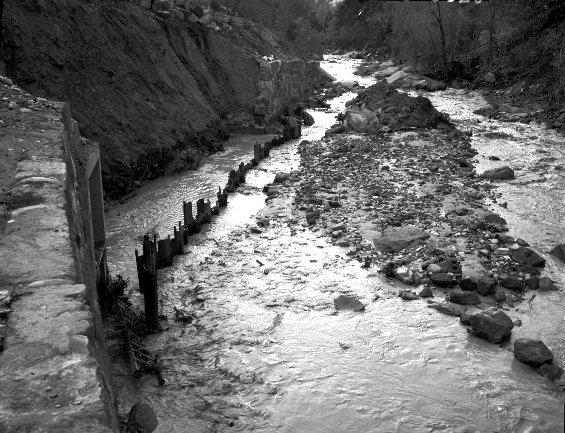 Flood damage to rock wall on Virgin River, a quarter mile south of Court of Patriarchs. Record of damage or defective workmanship. ; ZION Museum and Archives Image ZION 8608 ; ZION 15933