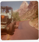Construction vehicle during chipsealing of Zion roads. ; ZION Museum and Archives Image 002.12.05-8of23 ; ZION 15933