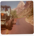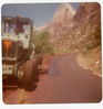 Vehicles driving down road with construction vehicle on opposite side during chipsealing of Zion roads. ; ZION Museum and Archives Image 002.12.05-4of23 ; ZION 15933