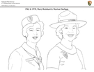 Coloring pages featuring two women in uniforms. On the left, Mary Rhinehart wears the 1962 "stewardess" uniform jacket, shirt, and pillbox hat. On the right, Marion Durham wears the 1970 women's uniform tunic and the NPS men's broad-brimmed hat.