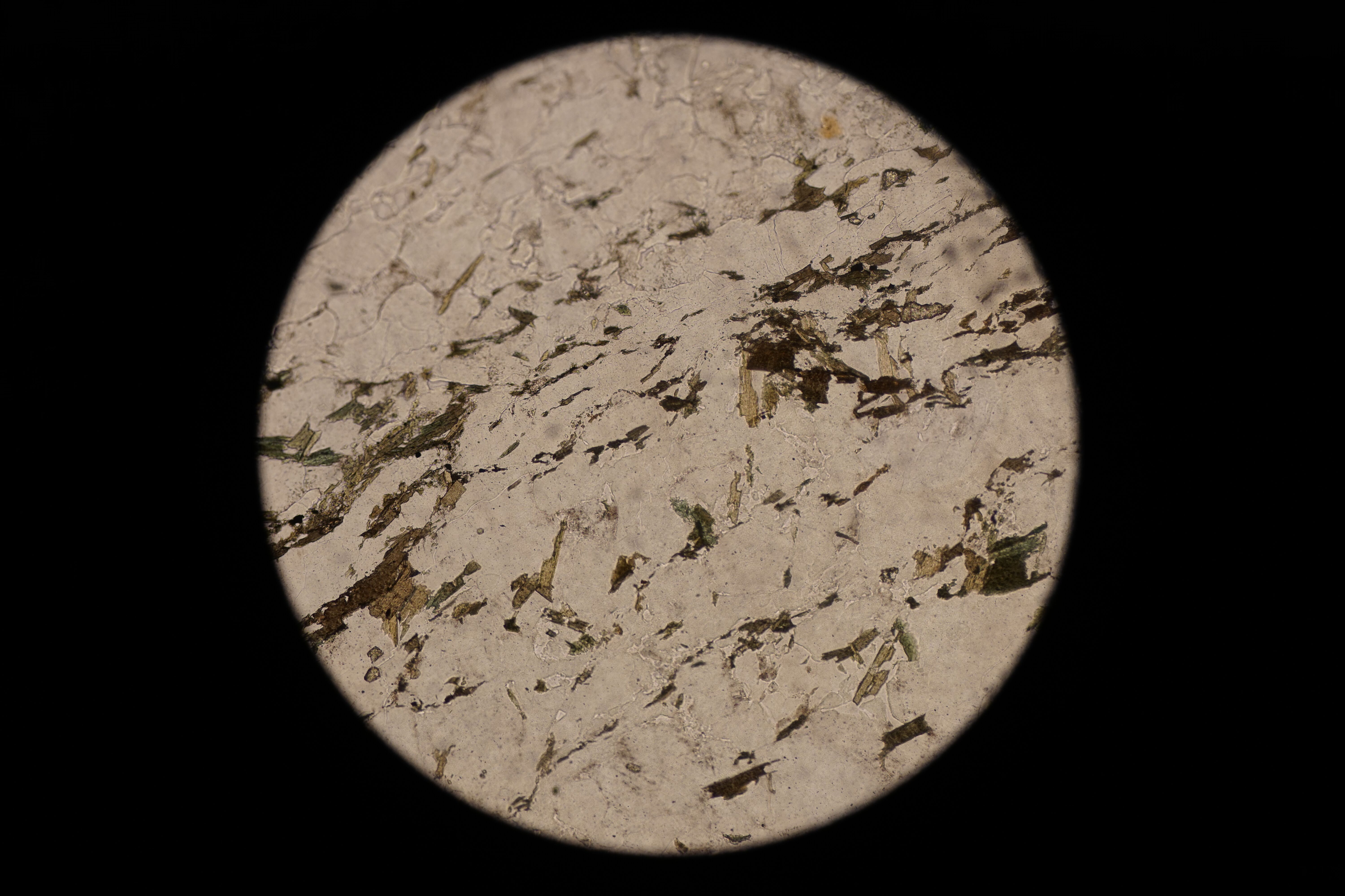 Microscopic image of a thin section of gneiss collected by Peter Misch from the west base of Eldorado Peak in 1961. One of six images. (Peter Misch Geology Collection, North Cascades NPS Complex Museum Collection.)
