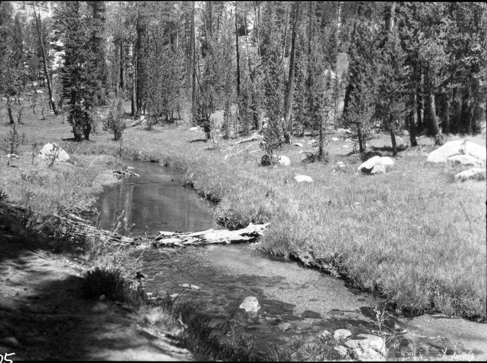 Lowell Sumner, 490728, Lost Canyon, SNP, Meadow studies, undamaged meadow, sod extending to water's edge unbroken is a sign of health. Misc. Creek, Lost Canyon Creek.