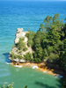 Eroded sandstone rock formation. The top harder rock looks like a castle turret. Trees line the top and sloping sides of the cliff and the Castle sits at the end with Lake Superior at its base.