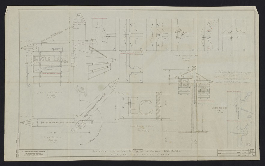 Detailed construction drawing for carriage road signs. Includes measurements, dimensions as well as notes on paints, stains, and materials. Drawing created by U.S. Department of the Interior National Park Service Branch of Plans and Design. Plan drawn by BLB and traced by BLB. ; Drawing No. N.P. - ACA 8074
