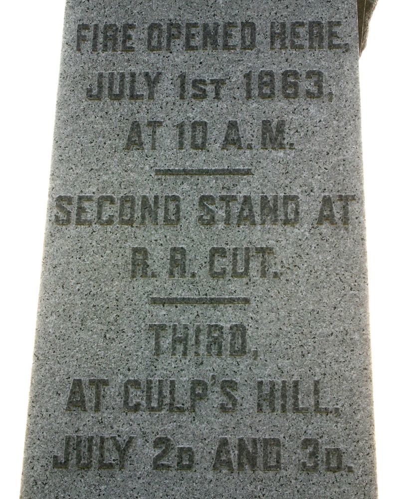 Marks position twice held by 76 New York Infantry on July 1, 1863. Position marker on summit of Culp's Hill marks position July 2 & 3 1863. 1 of 90 Mns in Park to NY commands at Gettysburg. Located N extreme, E side Reynolds Ave at McPherson Ridge. || Mn, 2 flank markers & 1 position marker. Rough hewn base, 6'9"x6'9". smooth shaft w/ polished raised inscriptions & apex top w/ encircled number, all 14' high. Flank markers, slant tops, 1'x1'x1'6". Position marker polished inscription W face & top.