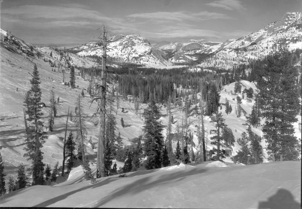 Two copy negatives possibly from Watkins originals. Top negative shows Tenaya Lake, bottom negative shows Tuolumne Meadows. From collection of Francis Farquhar; copied 12/November 1951.