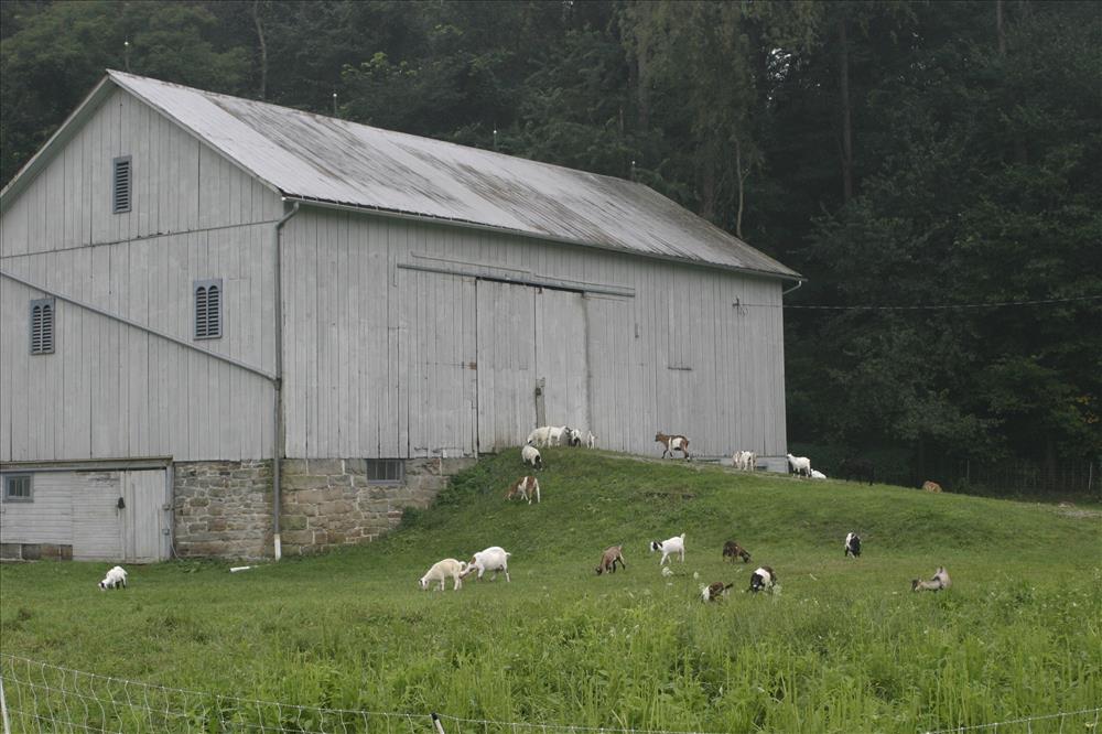 Fainting goats being raised for meat are pastured near the barn at Goatfeather Point. || Goatfeathers Point is one of eight farms in Cuyahoga Valley National Park's Countryside Initiative. This program invites farmers to live and farm in the park using sustainable methods that do not adversely affect resources. At Goatfeathers Point, the Bechter-Smith family sells humanely raised, pastured meat goats and heritage-breed turkeys and chickens.