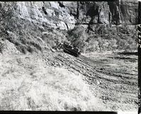 Rock retaining wall alongside the road at the slide area in Zion Canyon. ; ZION Museum and Archives Image 002_03012 ; ZION 13289