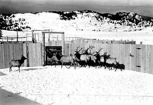 Crystal Creek Trap. Trapped elk at Mammoth awaiting transportation out of park in connection with herd size reduction program.