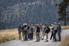 A park volunteer points to something in the distance for a large group of guided hike participants.