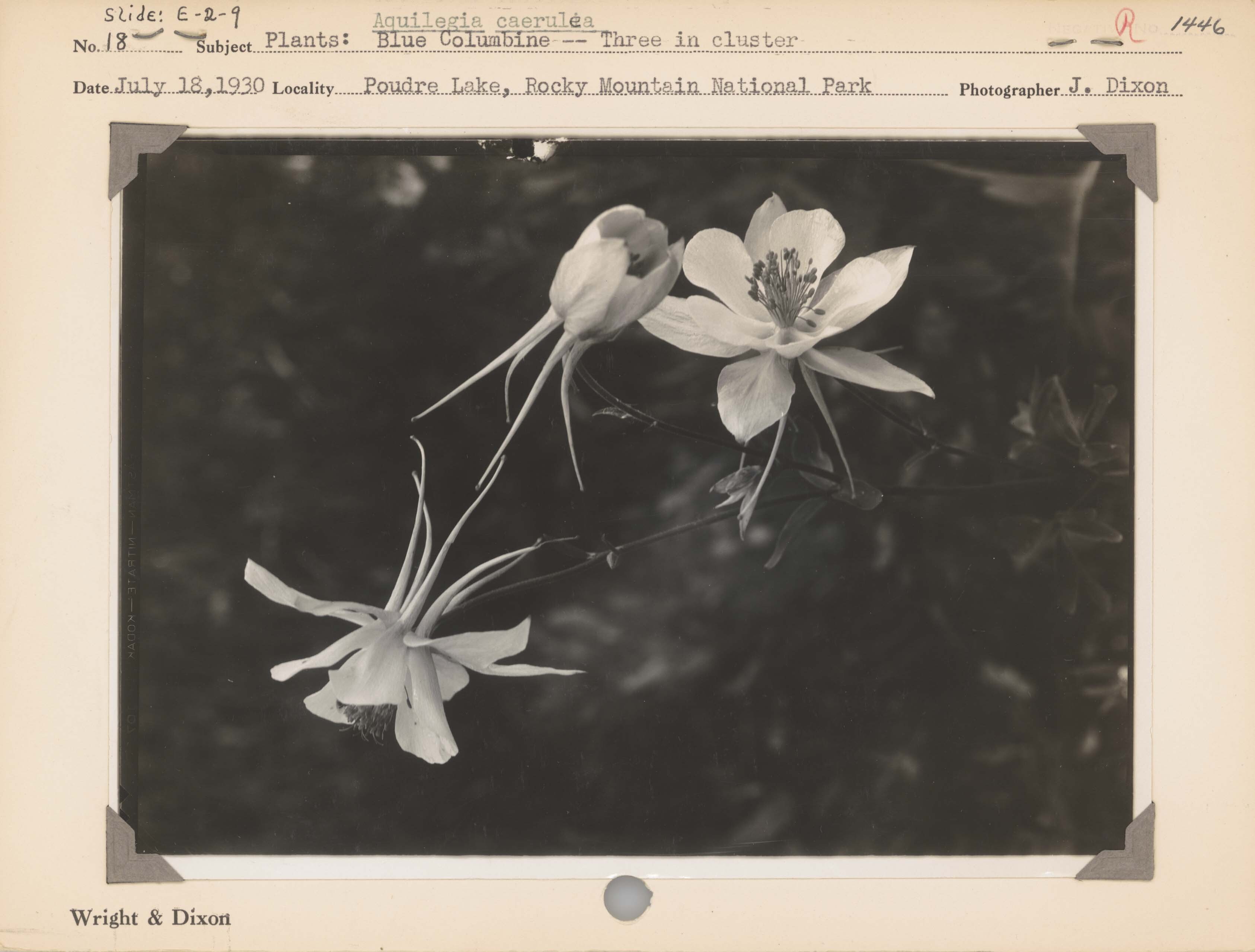 Plants--Blue Columbine (Aquilegia caerulea)--Three in cluster. Locality: Poudre Lake, Rocky Mountain National Park. Negative #: 1446