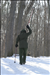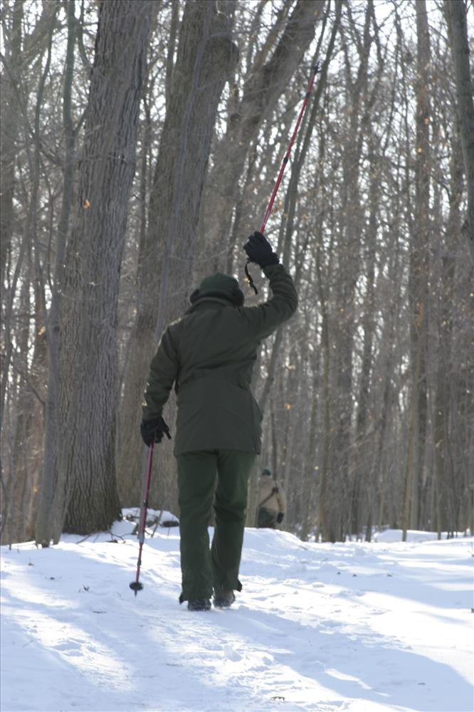 Visitors and park rangers hike on the Stanford Trail in winter.