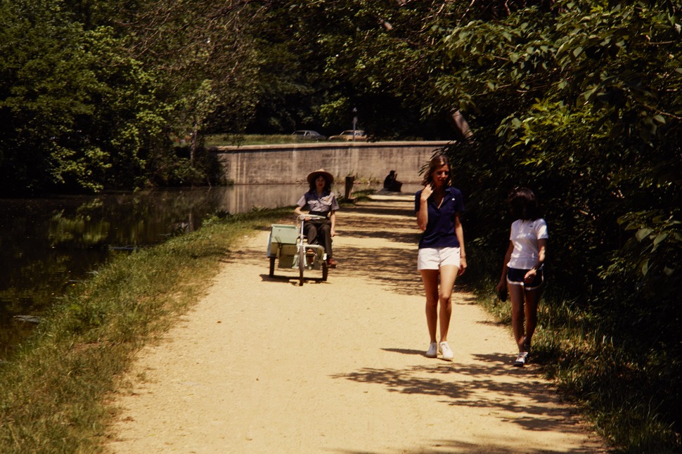 NPS employees, Anne Brooks, driving an energy saving machine in Chesapeake and Ohio Canal National Historical Park.