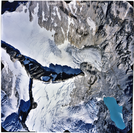 Color aerial photograph of glacier, snowfields, and alpine lake on mountain peak.