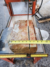 A reddish-tan rectangular stone block with a rough-cut face on the left side sits on the table of a rock saw. The stone has been cut partially through with a tape measure staged in the photo to show that the cut is 5.5 inches from the face of the stone. The frame of the rock saw and the blade poised above the cut are visible just behind the stone. The entire apparatus sits on blacktop, and several more stones, light tan in color, are sitting on wooden pallets in the background.