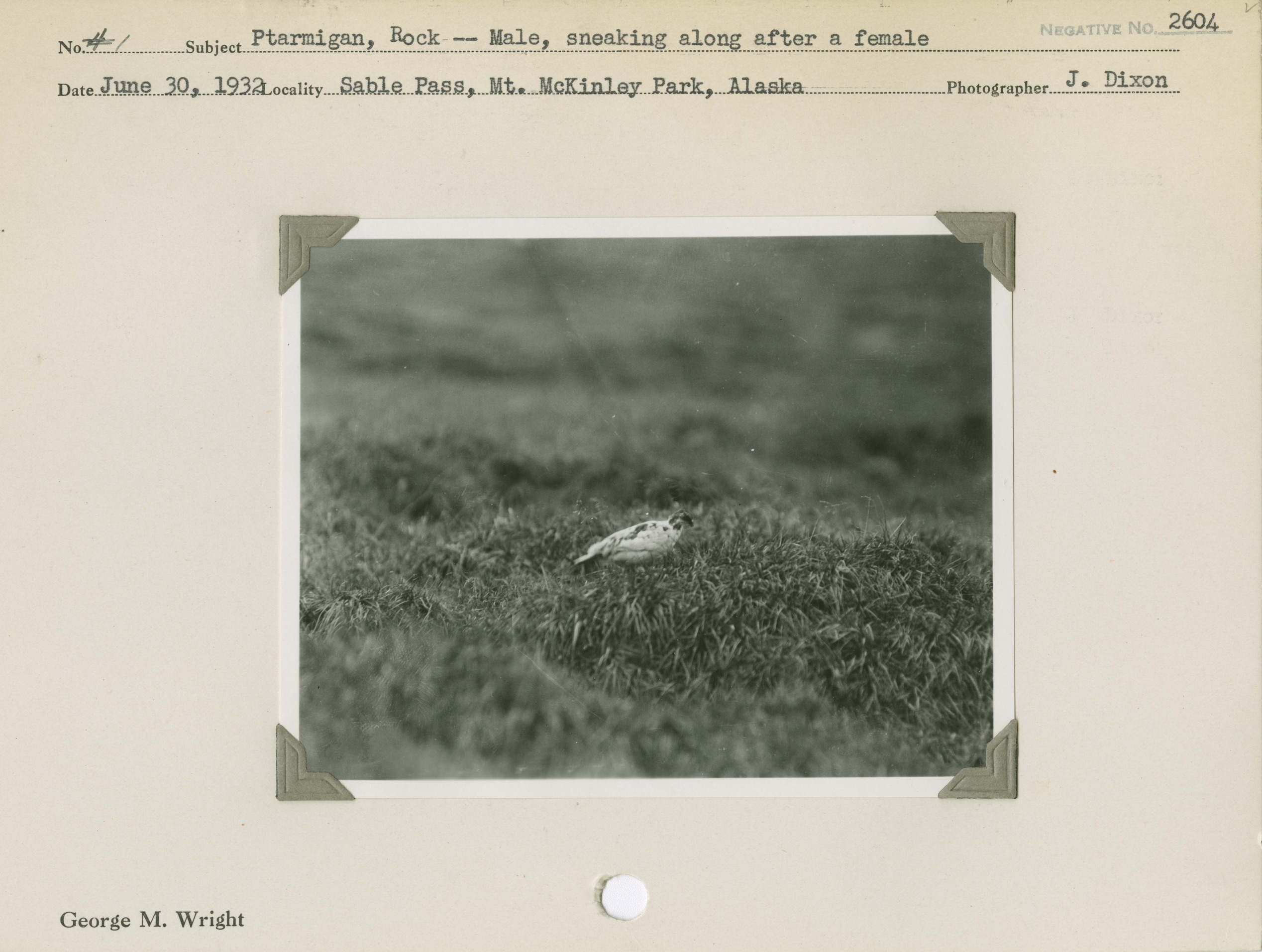 Ptarmigan, Rock -- Male, sneaking along after a female. Locality: Sable Pass, Mount McKinley [Denali] National Park, Alaska. Negative #: 2604