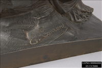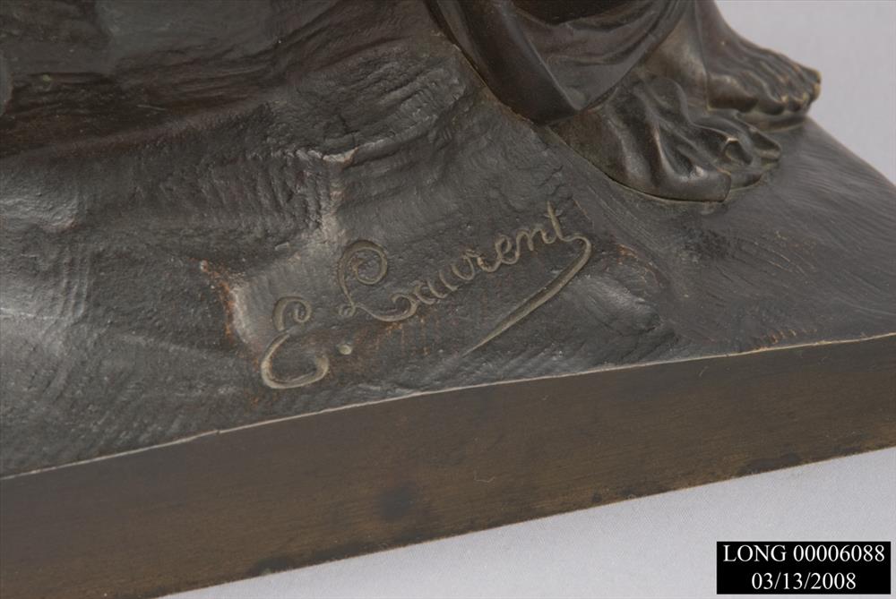 FULL-LENGTH VIEW, SUBJECTS HEAD FACING FRONT, BODY TURNED SLIGHLTY PROPER LEFT. SHORT WAVY HAIR, THIN EYEBROWS, MOUSTACHE AND SHORT WAVY BEARD. TOGA DRAPED OVER PROPER LEFT SHOULDER AND UNDER RIGHT ARM. TUNICA BENEATH TOGA, GIRLDED AT WAIST. SANDLES. SUBJECT SEATED ON A TREE TRUNK WITH PROPER RIGHT FOOT PLACED ON TOP OF A SMALL PLOW. RECTANGULAR BASE.'